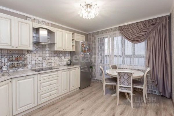 Согласно объявлению, внутри сделан современный ремонт с использованием качественных материалов. В квартире есть две спальни (одна из них с лоджией), гардеробная, кухня с выходом на лоджию, гостиная, раздельный санузел и просторные коридоры.
