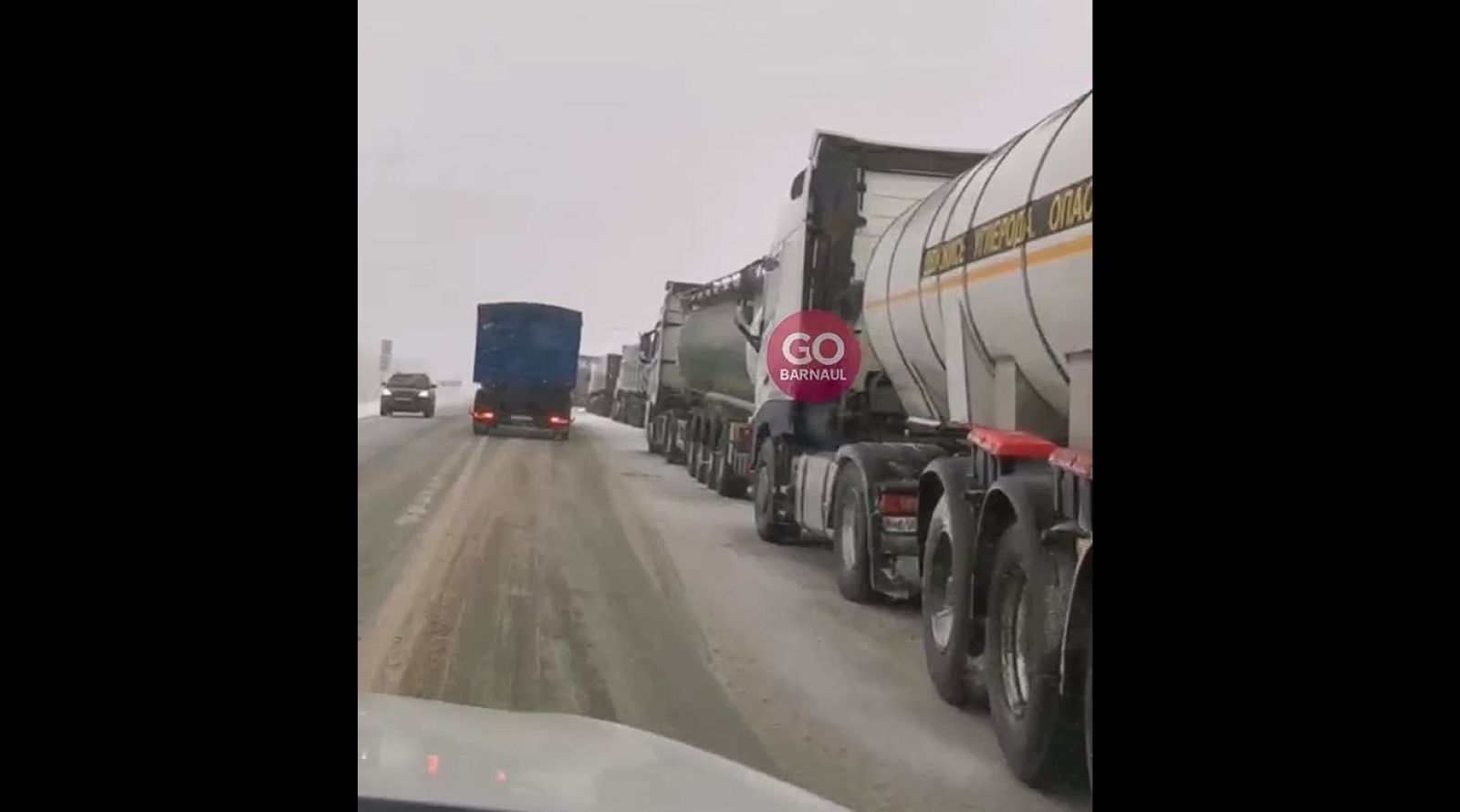 Автор видео уточняет, что большегрузы стоят перед перекрестком Троицкое/Целинное. Днем 24 ноября с 12.30 здесь ограничили движение из-за непогоды – с 212 км (от кафе "Облепиха") Первомайского района до 293 км в Троицком районе (поворот к селу Троицкому). Движение восстановят по мере улучшения обстановки.