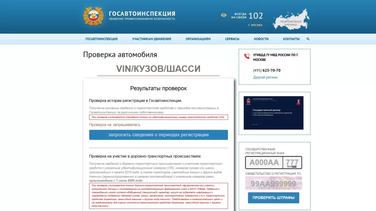 С помощью аналогичных сервисов, размещенных на сайте, можно проверить водительское удостоверение на предмет его подлинности. Можно проверить и автомобиль: попадал ли он в ДТП, не числится ли среди угнанных, не наложены ли ограничения на регистрационные действия, есть ли у автомобиля диагностическая карта (то есть пройден ли техосмотр) и т. д.