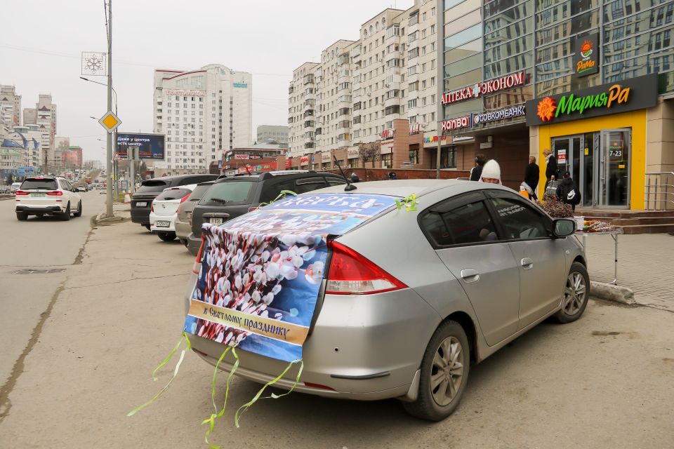 Рядом с торговым центром "Первомайский" красуется полная машина вербы. Владелец точки Валерий рассказал, что занимается продажей вербы уже 10 лет и традиционно заготавливает тысячу букетиков, которые быстро раскупают.