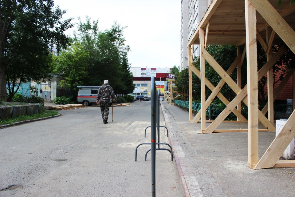 В настоящее время на территории ЖК все тихо и почти безмятежно. В этом мы убедились, прибыв на место вчерашних событий. Люди спокойно ходят по территории, доступ для жильцов в здание открыт. О том, что с многоэтажкой что-то не так, говорят лишь деревянные пристройки навесов, которыми оборудовали подъезды, барьеры и натянутые по периметру сигнальные ленты.
