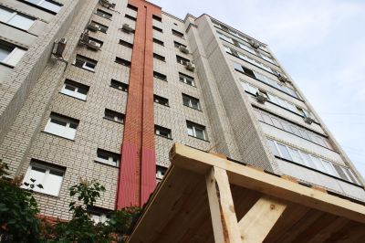 Кстати, ТСЖ уже подготовило все для демонтажа отслаивающихся элементов фасада – был найден подрядчик, сегодня утром он должен был приступить к демонтажу отслаивающейся кладки облицовочного кирпича. Сначала – над третьим подъездом. Для этого задействуют люльку для высотных работ.