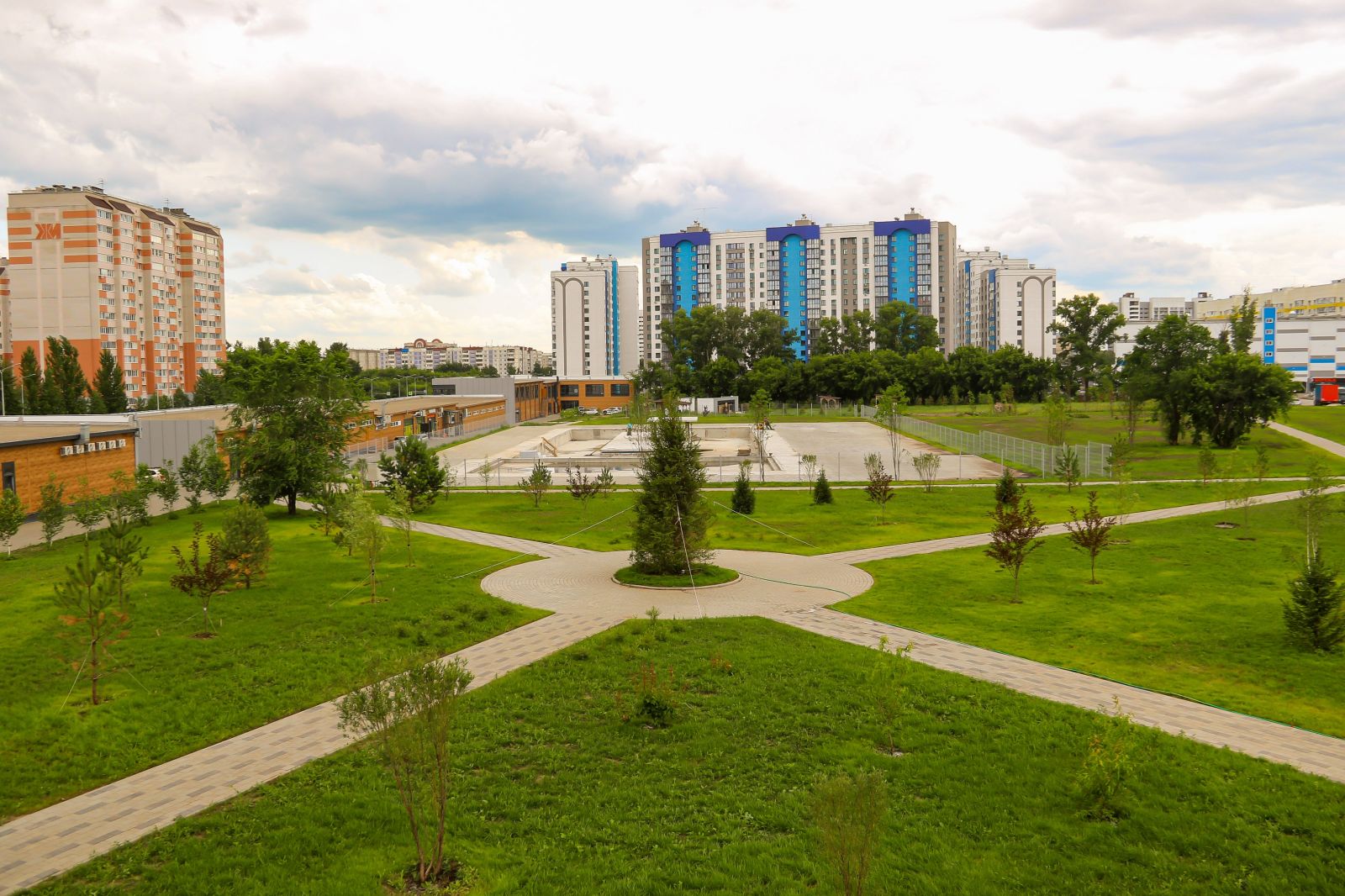 Сейчас в центре внимания – недавно высаженный газон, рассказал директор компании-застройщика "АльфА-ПроекТ" Алексей Тремасов. Как только зеленый ковер наберет силу, он станет самостоятельной зоной отдыха – для прогулок, пикников, солнечных ванн и т. п. После посева рабочие установят фонари уличного освещения, лавочки, урны и другие МАФы. Продолжится подготовка к запуску бассейна.