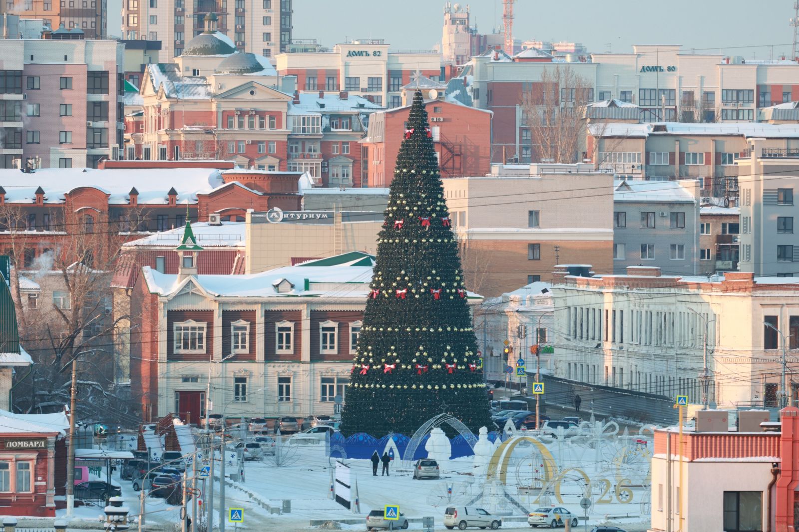 У подножия ели развернулся новогодний городок. В нем установили объемные цифры "2026", световые качели и скамьи, световые стены и интерактивные световые колонны, а еще: фигуры главных символов Нового года – Деда Мороза и Снегурочки. Кроме того, готовы зимняя горка и павильоны для ярмарки.