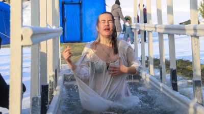 Очень низкие температуры не стали помехой для верующих. Сначала они собрались на утреннее богослужение в Знаменском храме, затем поучаствовали в крестном ходе к Оби, а сразу после самые смелые окунулись в реку.