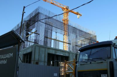 Будущий ЦУМ теперь видно невооруженным глазом. Судя по происходящему на стройке, рабочие готовятся к бетонированию второго этажа. Над высоким забором виднеется плотная сетка арматуры, в которой угадывается силуэт будущих стен монолитного стилобата.