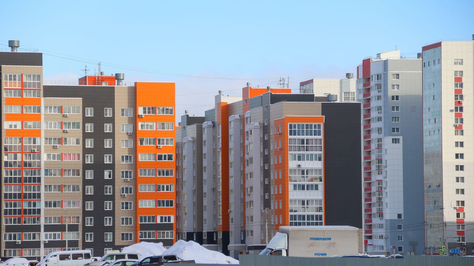 Справа высятся "коробки" будущего квартала "Камчатка", слева горизонт закрывают стройки и разноцветные многоквартирные дома микрорайона "Нью Терра" – такое негласное название получили кварталы новостроек, которые первыми оживили бывшие поля справа от улицы Просторной (в районе гипермаркета "Лемана Про"). Жизнь здесь кипит – некоторые ЖК уже заселены. Рядом ведутся стройки жилых комплексов "Флагман", "Широта", "Прайм", "Спектр".