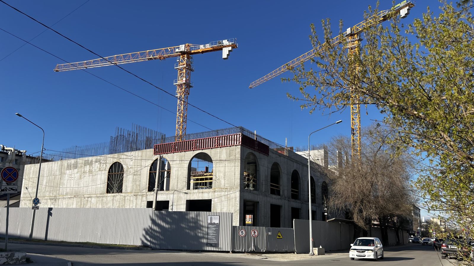 В настоящее время строители уже создали три этажа – один подземный и два наземных. Прохожие могут наблюдать арочные конструкции, возвышающиеся за забором. Также на стройплощадке началось возведение конструкций двух башен.