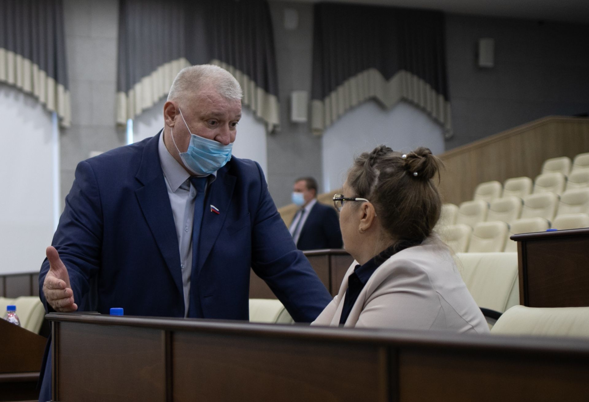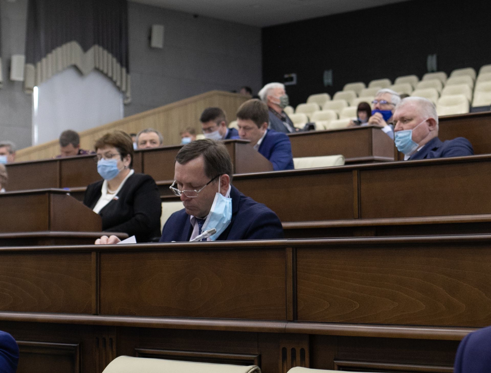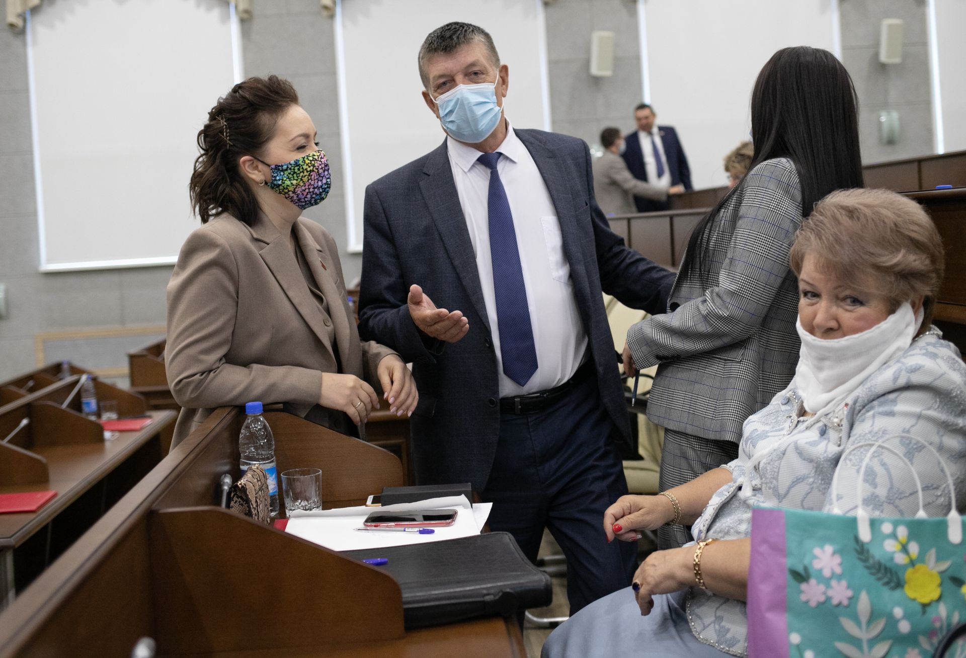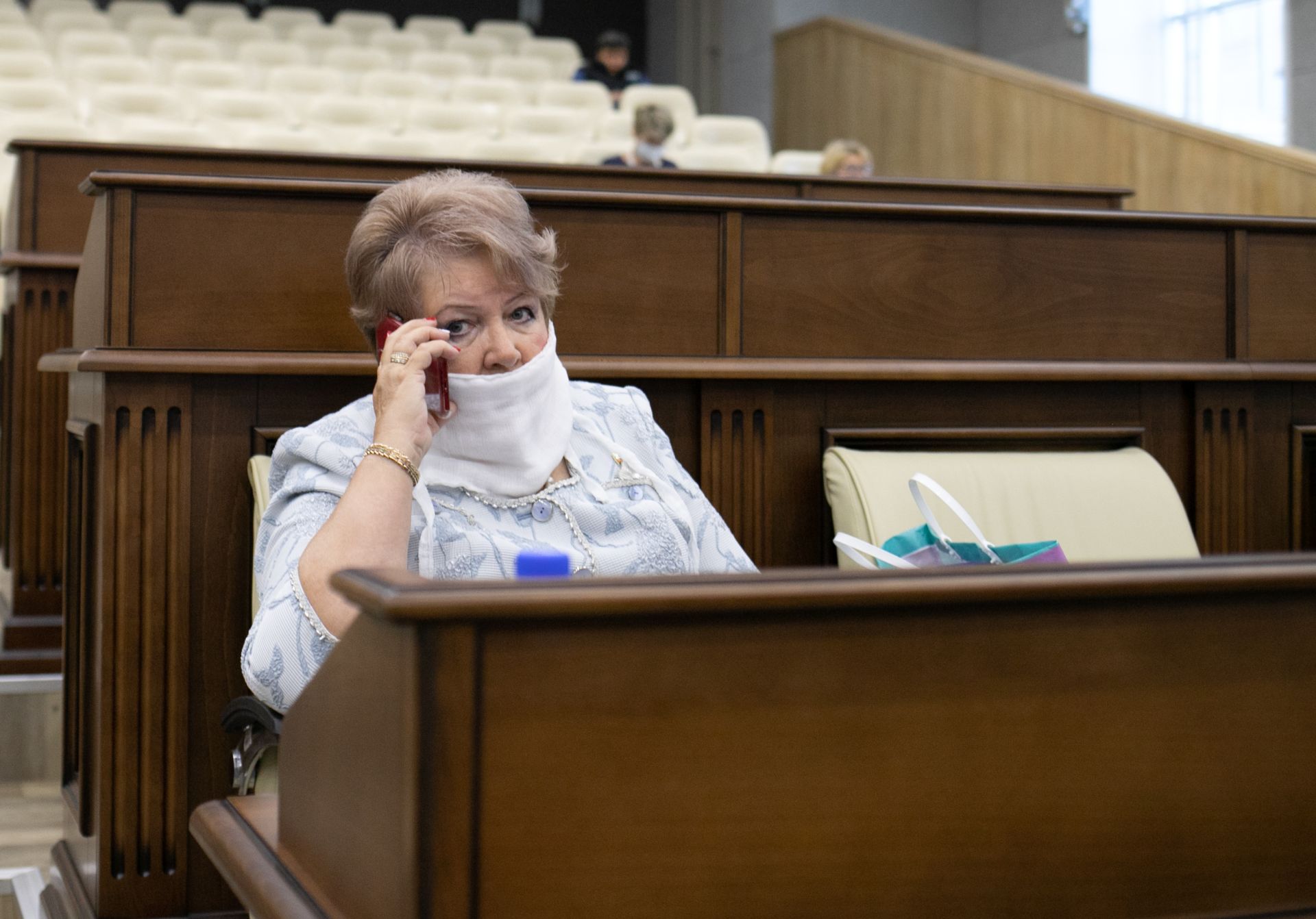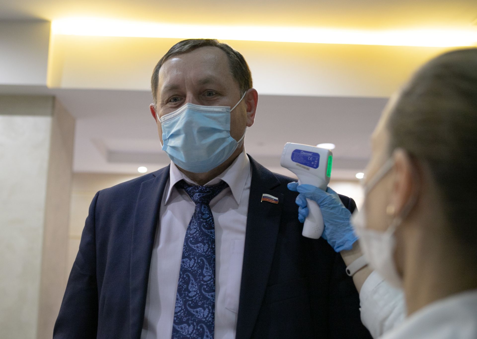 Во время заседания все депутаты соблюдали рекомендованную дистанцию в 1,5 метра, а после каждого докладчика дезинфицировали трибуну.