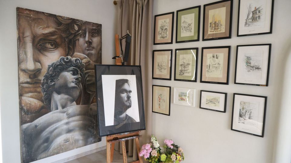 Обычно я работаю на больших холстах, в крупных форматах. Здесь [в галерее] их просто не разместить. Но у меня накопилось много материала в других жанрах. Мы с женой часто путешествуем, в это время нет возможности делать большие работы, но у меня всегда с собой блокнот, где я рисую совсем другие сюжеты в жанре графики. И люди проявляют большой интерес к ним, поэтому здесь они и представлены. Я надеюсь, что они будут как вызывать эстетический, образовательный интерес, так и находить свое место в домах людей.