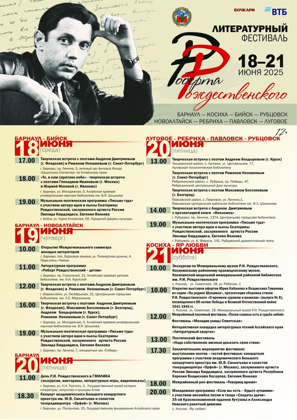 Литературный фестиваль Роберта Рождественского – традиционное мероприятие для региона. Событие стартует 19 июня в Барнауле, а завершится 21 июня в селе Косиха – на родине поэта