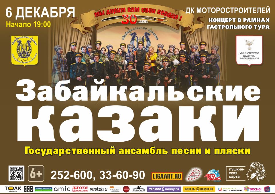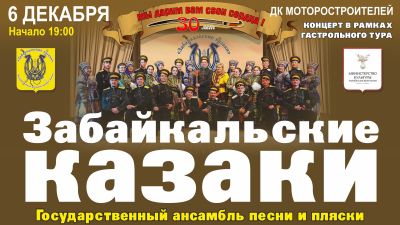 Праздничный концерт "Мы дарим вам свои сердца", посвящённый 30-летию создания государственного ансамбля песни и пляски "Забайкальские казаки", состоится 6 декабря в 19.00 в ДК Моторостроителей