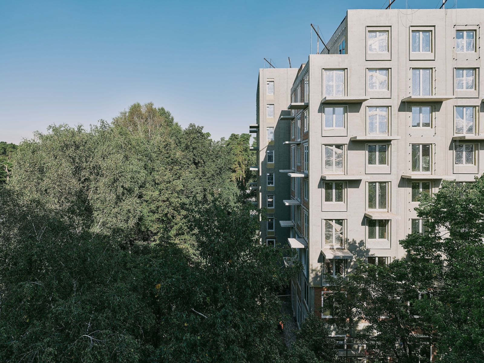 Естественно, большое значение уделяется и эстетической стороне вопроса. Фасады обращают на себя внимание рамками вокруг углубленных окон и балконов. Эстетичная белая оцинковка объединяет декоративную функцию, добавляя оригинальности облику квартала, и практичность, обеспечивая защиту от погодных факторов и поглощение шума дождя.