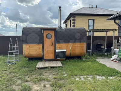 Частный дом с гаражом и газовым отоплением находится в Санниково. Мобильная баня из дерева не входит в базовую стоимость и может быть приобретена отдельно за 250 тысяч рублей
