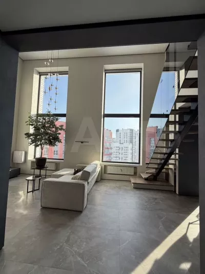 Общая площадь жилья на двух уровнях составляет 100 квадратных метров. Высота потолков достигает 5,5 метра. Есть лоджия, раздельный санузел и кухня площадью 15 квадратных метров.