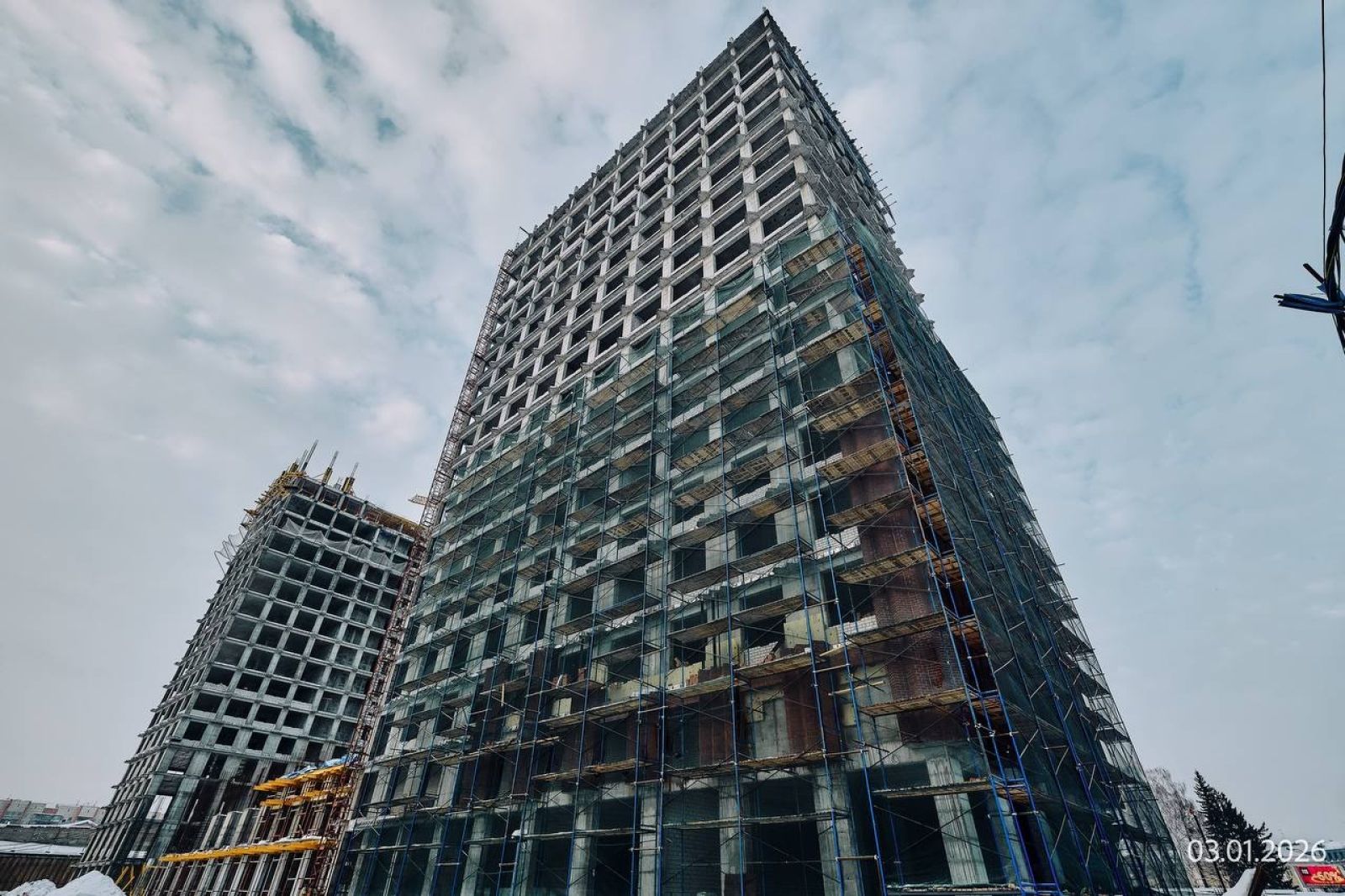 Башня 2. В декабре застройщик завершил возведение монолитного каркаса башни. В январе продолжил работы по утеплению и облицовке фасада керамическим кирпичом, а также монтажу внутренних систем вентиляции. Параллельно ведется кладка наружных и внутренних кирпичных стен на 15-м и 16-м этажах.