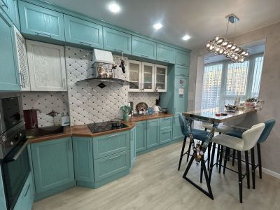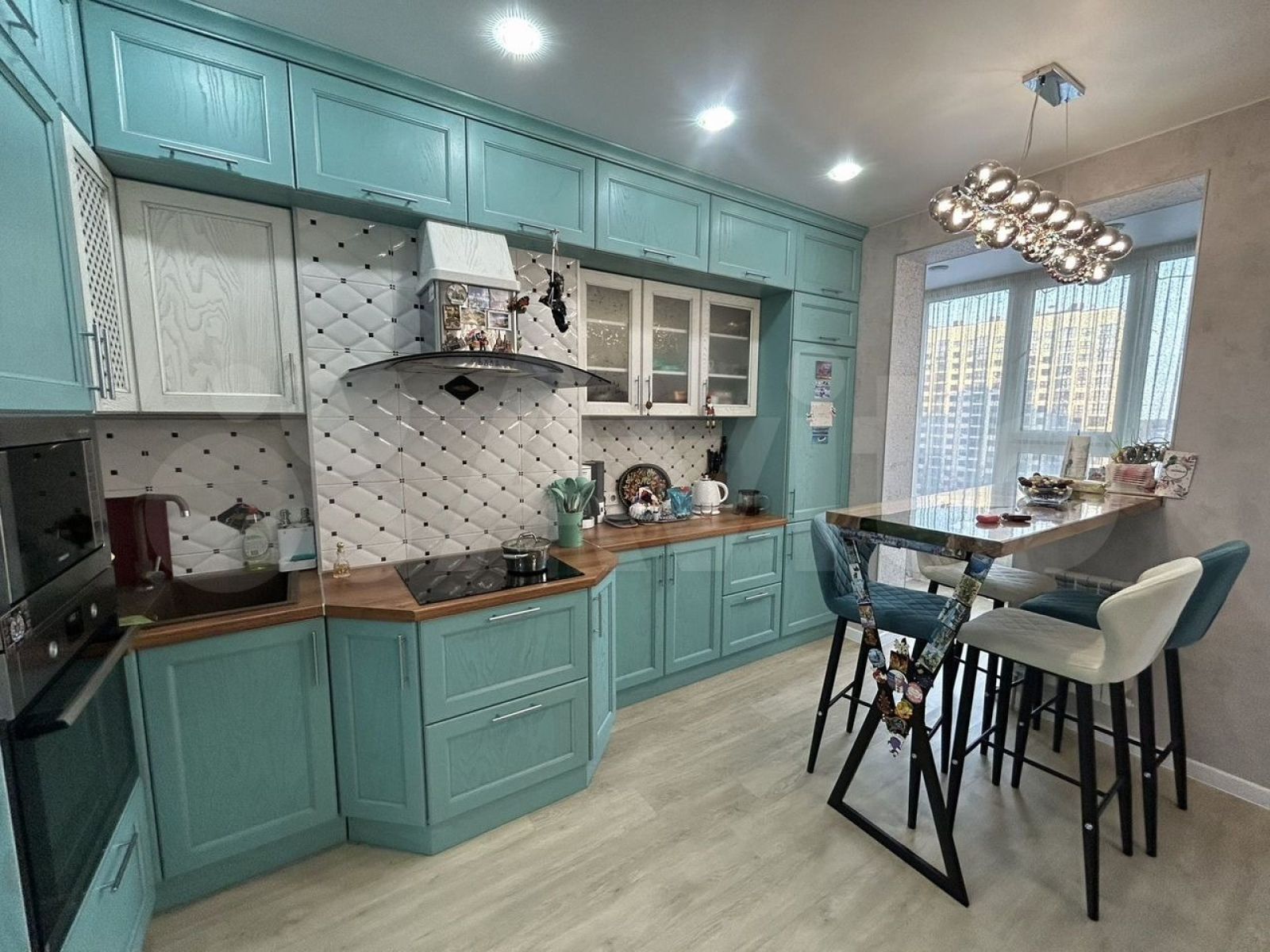 Квартира площадью 79 кв. метров расположена на 10 этаже кирпичного дома, окруженного хвойным лесом. Интерьер выполнен в современном стиле с яркими акцентами, а кухня оформлена в бирюзовых тонах и оснащена всей необходимой техникой, включая холодильник и посудомоечную машину.