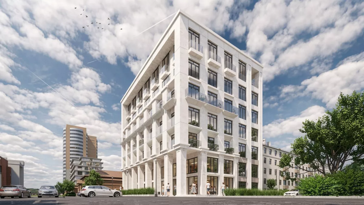 "Элементы балконов имитируют капители и пилястры, что также перекликается с памятником. За счет более светлых тонов он не затмевает существующий облик памятника. Здесь чуть больше витражного остекления, что завязано с уже заданной застройщиком бизнес-центра О2", — пояснила Любовь Пшеничкина.