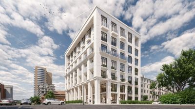 Для комплекса предложены два типа фасадов. В первом сделан акцент на монументальную колоннаду. Современное прочтение архитектуры выражается в акценте на витражные остекления и стеклянные ограждения балконов, сообщили градсовету.
