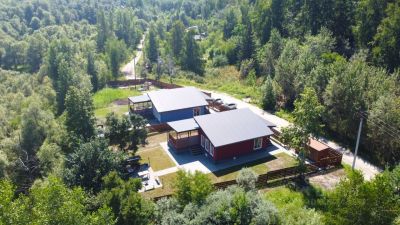 Суммарная площадь строений составляет 185 квадратных метров, дополнительно у каждого дома есть террасы. Внутри находятся жилые помещения, кухня-гостиная, а также зоны отдыха, включая сауну и душевые. К территории ведет щебеночная дорога.