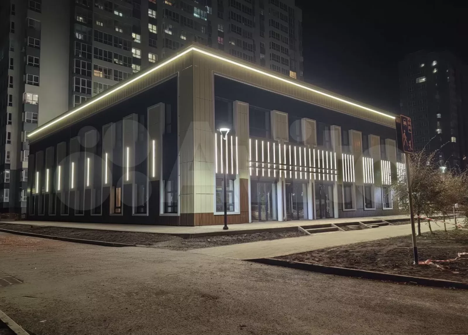 Здание введено в эксплуатацию, без внутренней отделки. Высота потолков — 3,9 метра, есть наземная парковка на 32 машины, фасады здания с подсветкой.