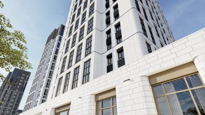 Паркинг и коммерческий этаж будут монолитными, а жилые башни построят из железобетонных панелей. Для отделки фасадов используются навесные конструкции в светлых тонах и под медь. Образ дополняют витражи и специальные корзины для кондиционеров.