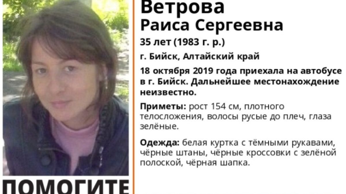Пропала 35-летняя Раиса Сергеевна Ветрова. 18 октября 2019 года она приехала на автобусе в город Бийск, и дальнейшее ее местонахождение неизвестно, сообщает поисково-спасательный отряд "Лиза Алерт" в Алтайском крае.