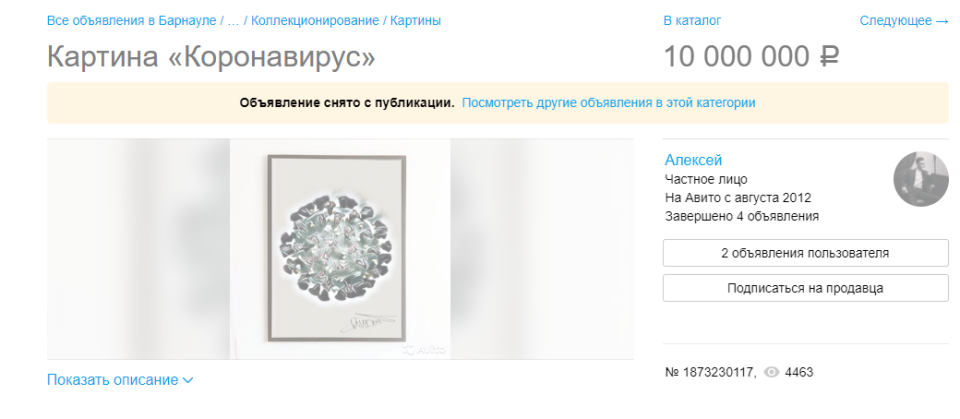 К сожалению, данное объявление уже снято. Нашел ли этот "шедевр" хозяина, неизвестно. Картина "Коронавирус" за 10 млн рублей.