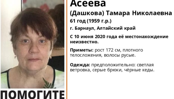15 июня в Барнауле нашли живой 61-летнюю пенсионерку Тамару Асееву, пропавшую 10 июня. Об этом сообщает волонтерский отряд "Лиза Алерт" в соцсети "ВКонтакте".
