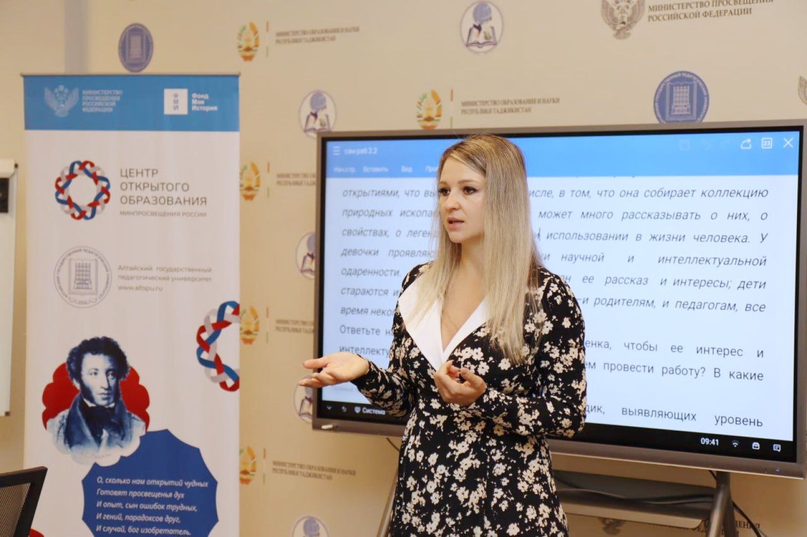 "В курсе рассматриваются значимые теоретические вопросы и актуальные практические проблемы, такие как особенности развития и поведения одаренных детей, проблемы выявления одаренности ребёнка, организация воспитательной работы с одаренными детьми, помощь детям в развитии и прогрессе. Занятия курса организованы на базе Российско-таджикской школы им. Д. И. Мендеева в г.Турсунзаде, которая является одним из флагманов российского образования в Республике Таджикистан. Для слушателей курса пройдут экскурсии в Кванториум, встречи с руководителями кружков и секций, во время которых учителя школы поделятся с коллегами передовым российским опытом развития и поддержки одаренности у детей", – рассказала преподаватель АлтГПУ, ведущая курсов Ксения Дедусенко.
