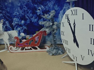 Особенно креативно к праздничному оформлению подошли в детском саду №215. Здесь воспитатели и дети превратили музыкальный зал в настоящую новогоднюю сцену. Центральным элементом стала композиция с большими часами, отсчитывающими время до полуночи, а также декоративные сани и олени.