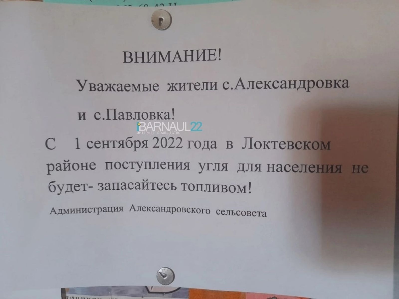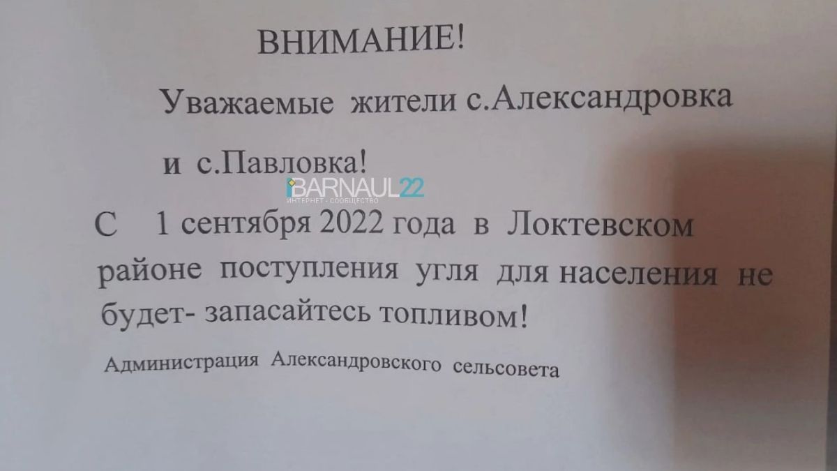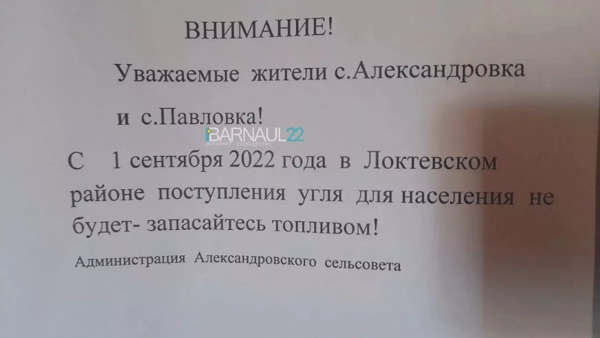 По словам жителей села Александровка, в сельсовете разместили объявление, в котором говорится, что с 1 сентября в районе больше не будут возить уголь.