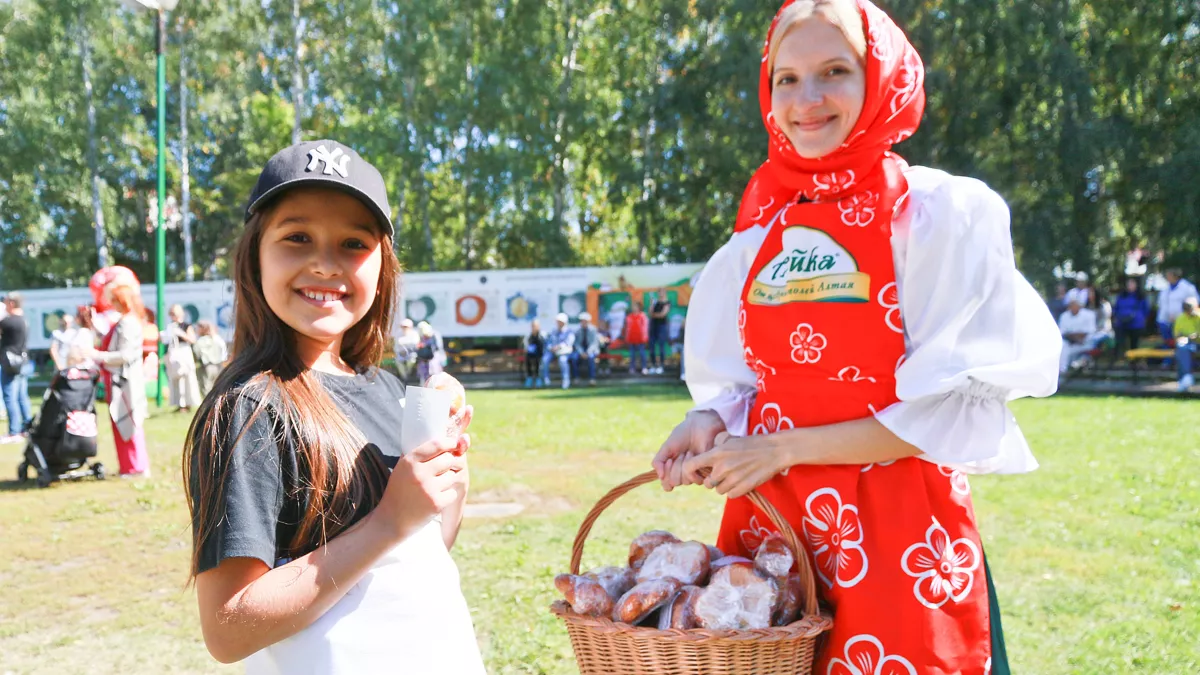 Кстати, на протяжении всего праздника ее "сестры" курсировали между прохожими и рядами зрителей с угощениями в корзинах. Вкусные и ароматные булочки из алтайской пшеницы расходились даже быстрее, чем горячие пирожки.