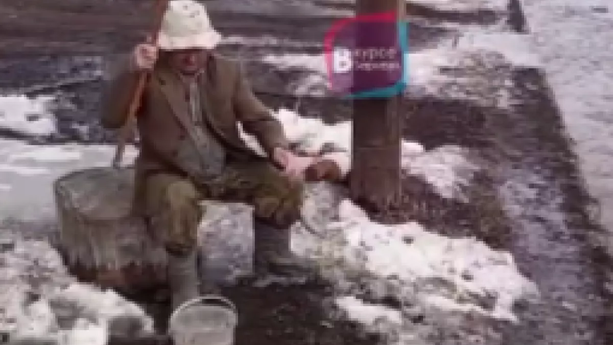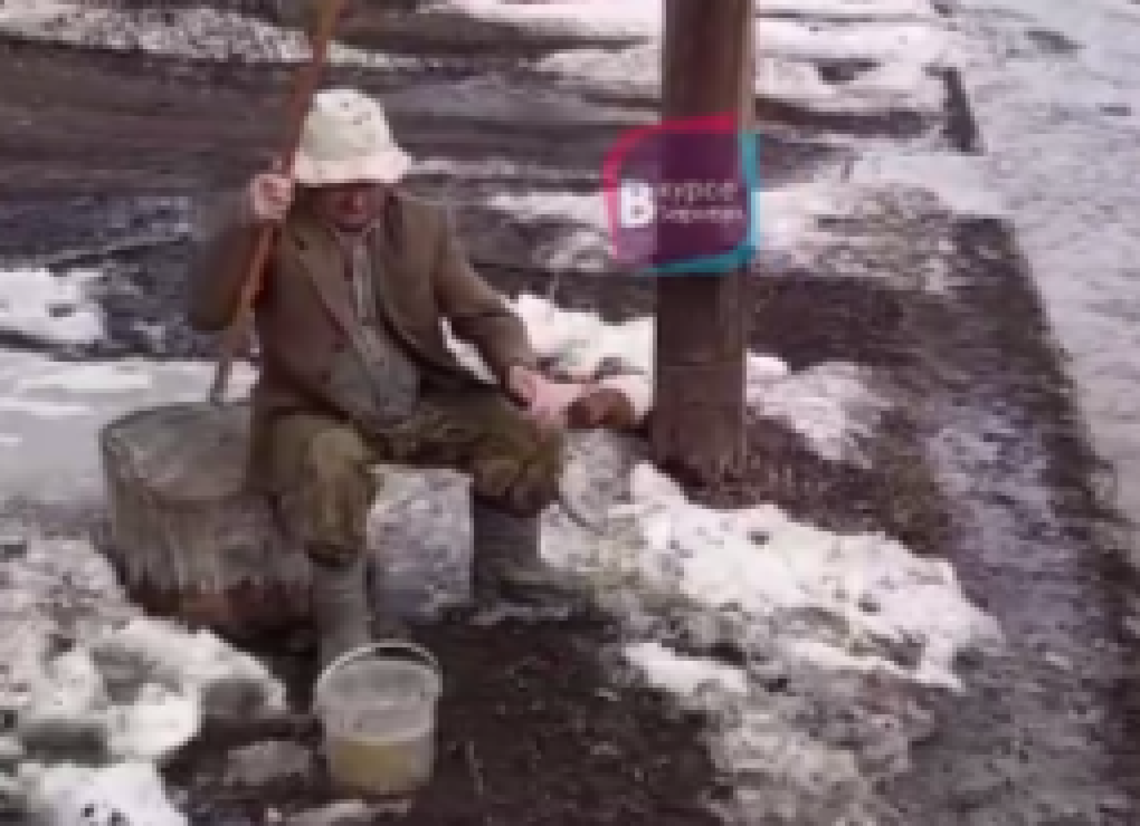 На кадрах видно, как мужчина сидит возле дороги рядом с домом и рыбачит. В какой-то момент у него начинается клев, и сельчанин вытаскивает из воды селедку.