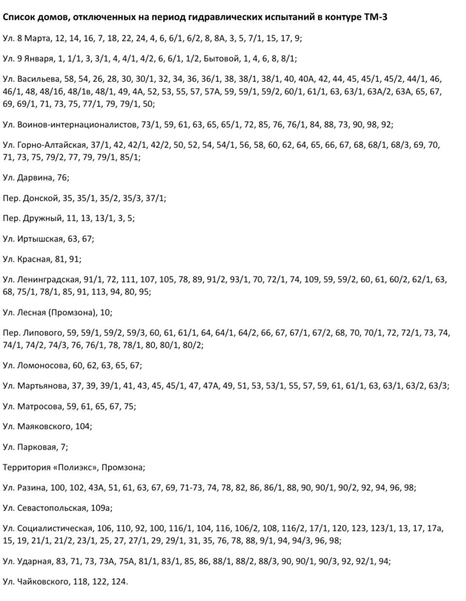 В Бийске 12 мая начался второй этап гидравлических испытаний в контуре тепломагистрали № 3. В связи с этим по ряду адресов отключат горячую воду, сообщает пресс-служба СГК Бийска.