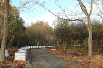 На территории за ТЦ "Европа" по улице Шумакова, 9 завершается устройство пешеходных дорожек, идет укладка плитки и бесшовного резинового покрытия для будущих площадок. В настоящее время рабочие продолжают монтировать освещение: накануне приступили к установке светильников. Кроме того, ведутся подготовительные работы к посадке деревьев. Частично проведена разбивка участков, места, где будут высажены зеленые насаждения, размечены кольями. Всего в этом году на территории планируется высадить 190 деревьев и более 2,5 тысячи кустарников. Здесь работает подрядная организация ООО "Ной".