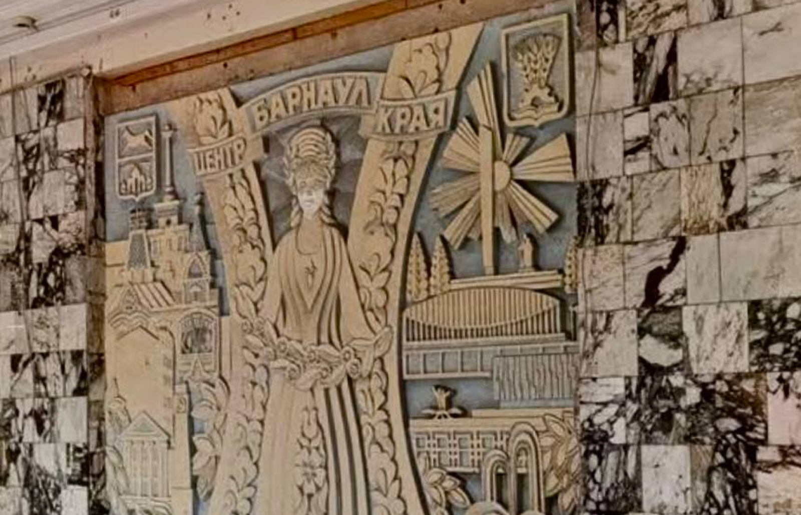 Панно с изображением женщины и надписью "Барнаул — центр края", найденное в барнаульском "Доме под шпилем", сохранят и отреставрируют. Об этом в своем telegram-канале заявил архитектор Александр Деринг.