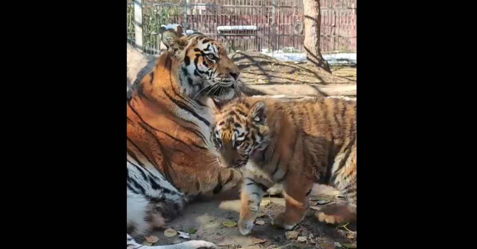 На опубликованных кадрах малыши играют с родителями солнечным утром. Сейчас тигрятам уже восемь месяцев, и они активно познают мир.