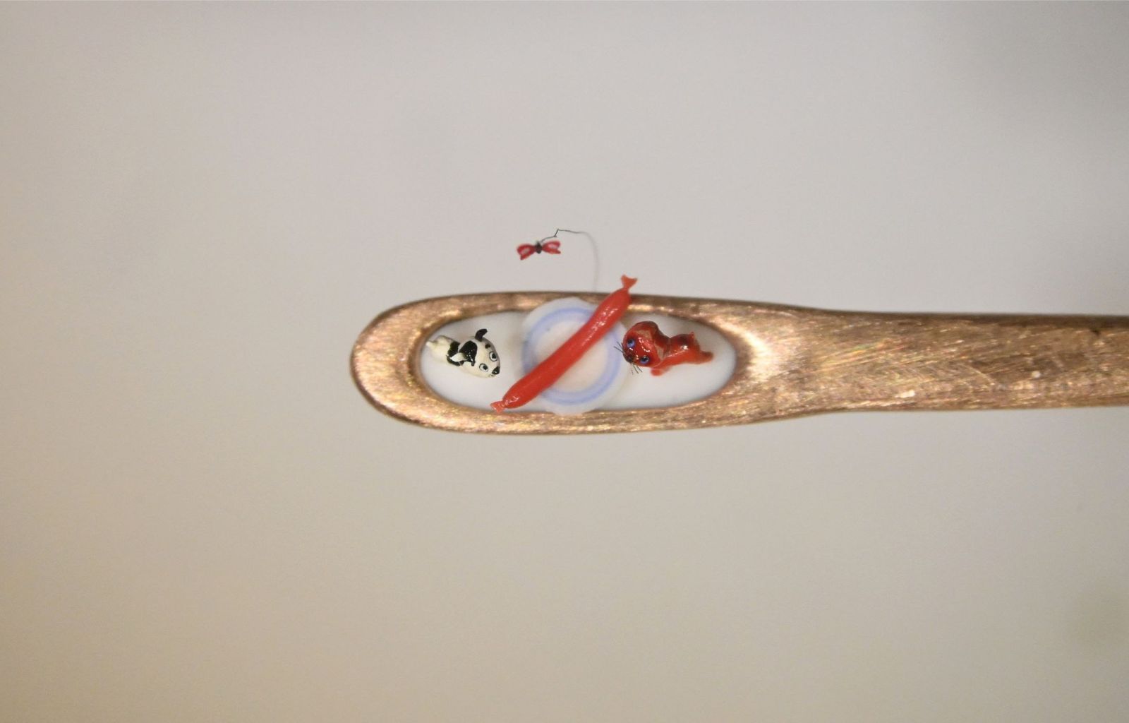 Котенок Гав и его друг щенок Шарик стоят рядом с тарелкой, на которой лежит большая сосиска. Высота фигурок – около 1 мм, парящей над ними бабочки – вовсе 0,4 мм.