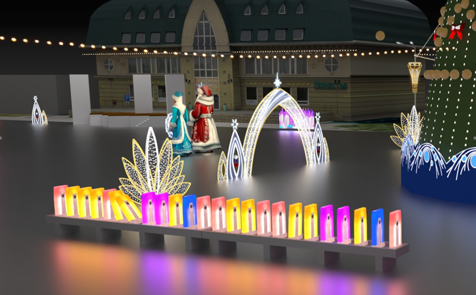 Праздничная инфраструктура включает в себя главную городскую елку, ярмарочные ряды, зимнюю горку с несколькими спусками, световые объекты, тематические фотозоны и аттракционы. Также на площади установят вагончик полиции, однако его украсят в новогоднем стиле. Основные места активности расположатся у ТЦ "Поместья".