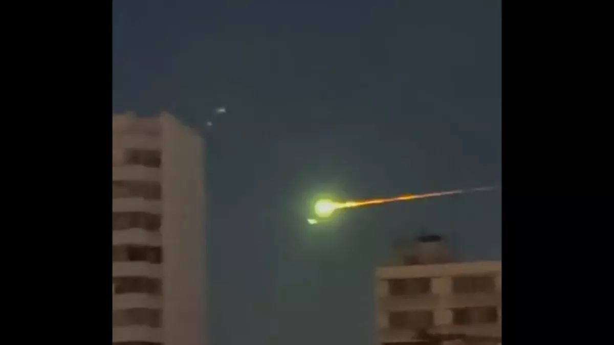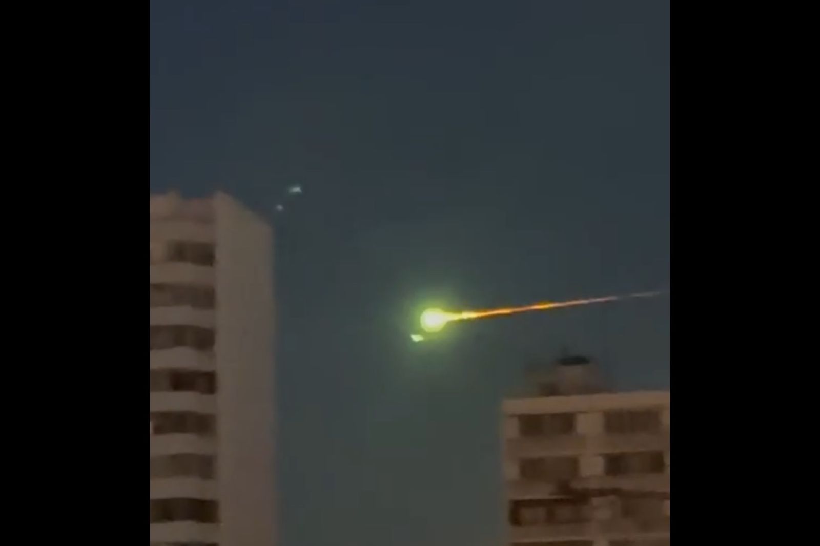 Неопознанный объект светился ярким зеленым светом на фоне темного неба. Он быстро летел по направлению к земле, за ним шел словно огненный след
