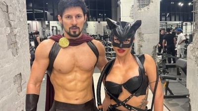 Костюмированная вечеринка проходила в спортзале Дубая. В кадре Дуров с фитнес-моделью Илоной Коринец в образе женщины-кошки