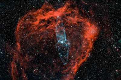 В глубинах созвездия Ящерицы, в тысячах световых лет от Земли, алое облако водорода переплетается с бирюзовым сиянием кислорода. Эти два цвета, рожденные энергией звезды HR 8119, создают иллюзию движения – будто в космосе плывет живое существо.