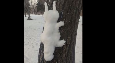 Снежная белка была слеплена на дереве одним из посетителей парка "Изумрудный". С помощью "магии" технологий животное начало перебирать лапами