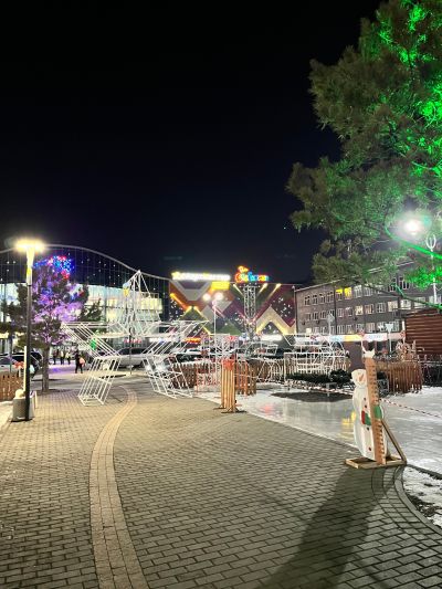 На площадке перед торговым центром уже царит новогодняя атмосфера: заливается каток, развешиваются гирлянды и прочие праздничные атрибуты