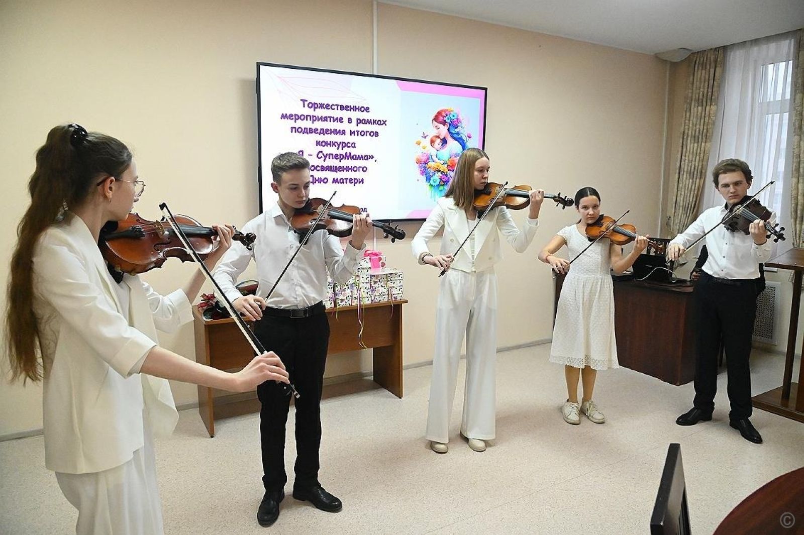 Музыкальными номерами участниц и победительниц конкурса "Я – СуперМама" поздравили юные артисты ансамбля "Жамевю".