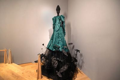 Платье с символичным названием "Волшебный лес" таежного цвета отсылает к образу русского народного костюма с длинными пышными рукавами и тонким силуэтом. Все швы выполнены в органичной, биоморфной эстетике – без прямых линий, словно повторяя пластику растительных форм. Платье украшено объемными 3D-листьями, выполненными в кутюрной ручной технике. На создание ушло 12 метров ткани из переработанного пластика и 120 часов работы закройщиков, швей и вышивальщиц.