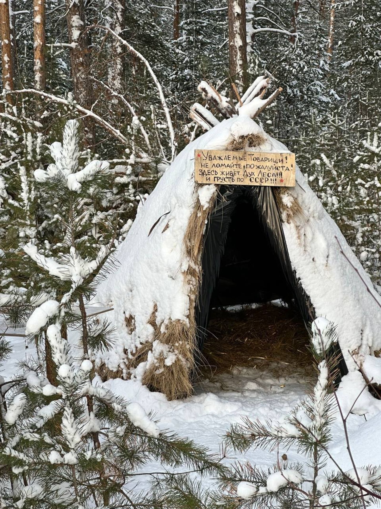 Над входом висит табличка: "Уважаемые товарищи! Не ломайте, пожалуйста! Здесь живет дух леса и грусть по СССР!"
