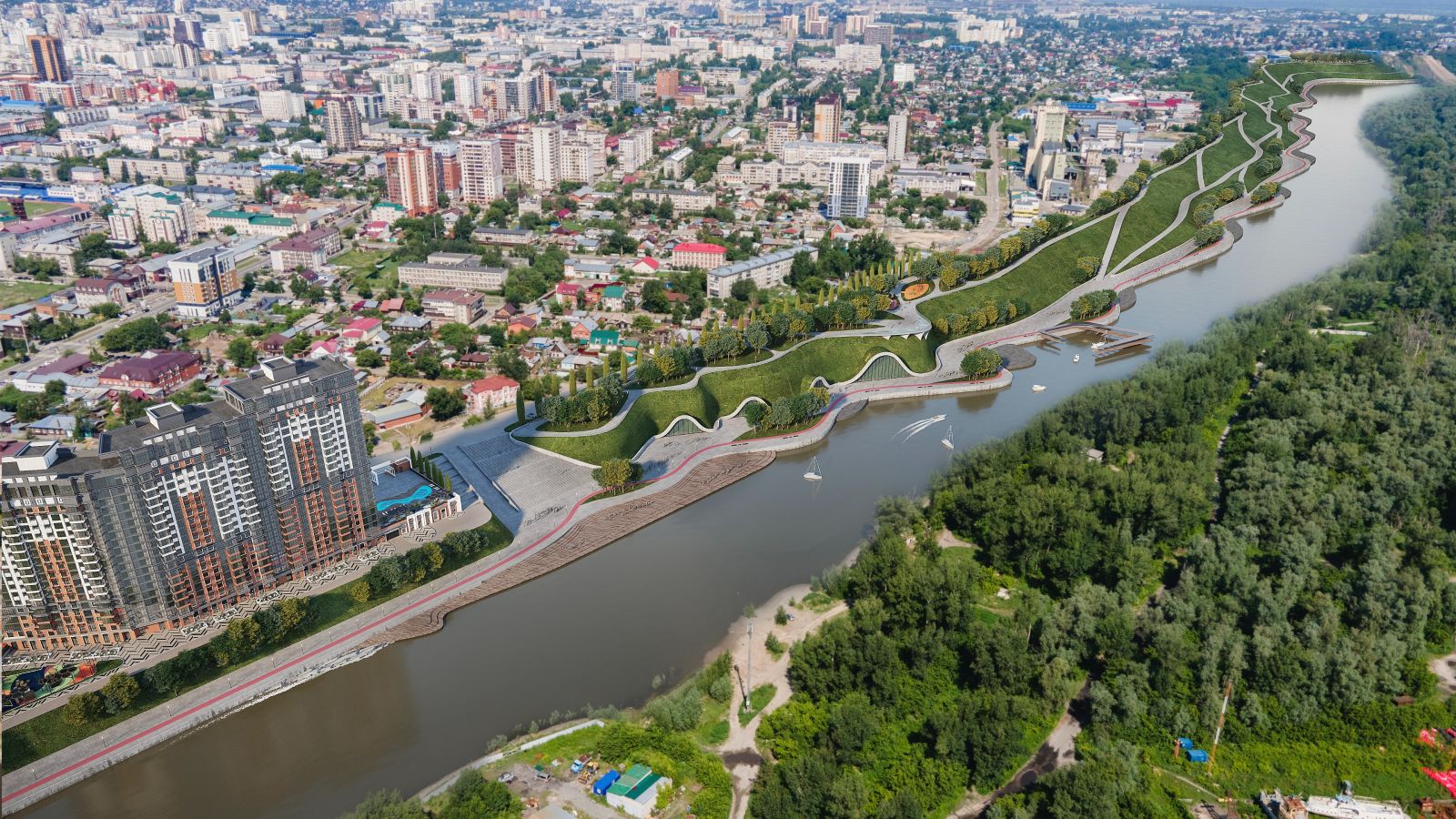 Застройщик продолжает проектировать новую набережную на берегу Барнаульского ковша. В будущем здесь может появиться полноценная зона отдыха с парком, местами для прогулок и магазинами на склонах. Пока идет проработка деталей эскиза. Его планируют реализовать к 300-летию города. Разбираемся, что известно о проекте и как выглядит историческое место, где проектировщики увидели трехуровневую набережную, утопающую в зелени.