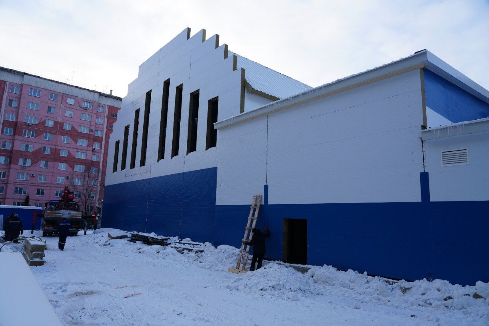 Сотрудники подрядной организации установили металлический каркас здания, завершили монтаж наружных стеновых сэндвич-панелей, внутренних перегородок из сэндвич-панелей, сэндвич-панелей перекрытия здания, а также устройство системы вентиляции и наружной сети холодного водоснабжения.